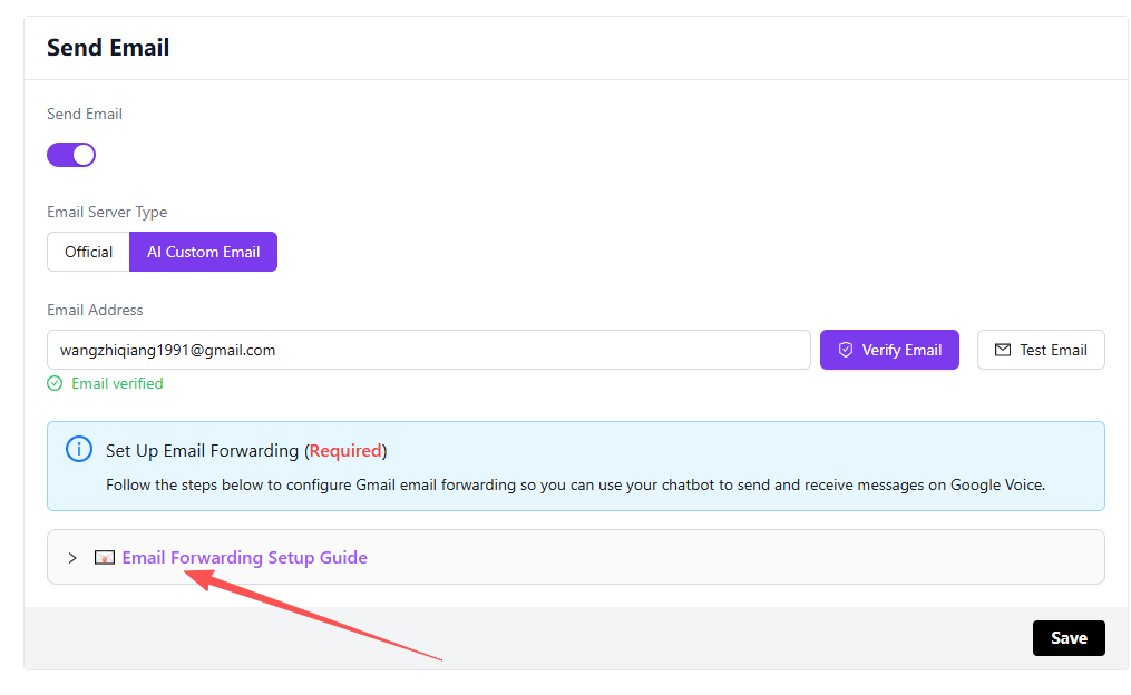 Test completed. You can now proceed to set up email forwarding. Please refer to the page documentation for details.
